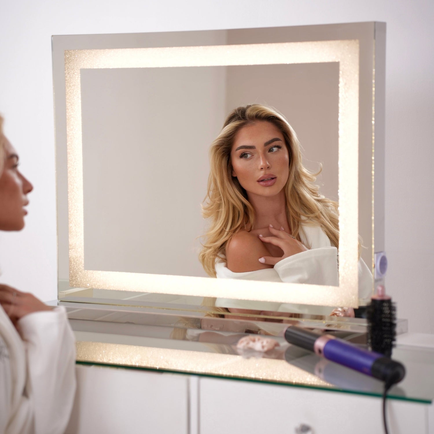 Shinny est un miroir LED haut de gamme, orné de cristaux, conçu pour illuminer ta routine beauté avec élégance et une touche de magie. ✨