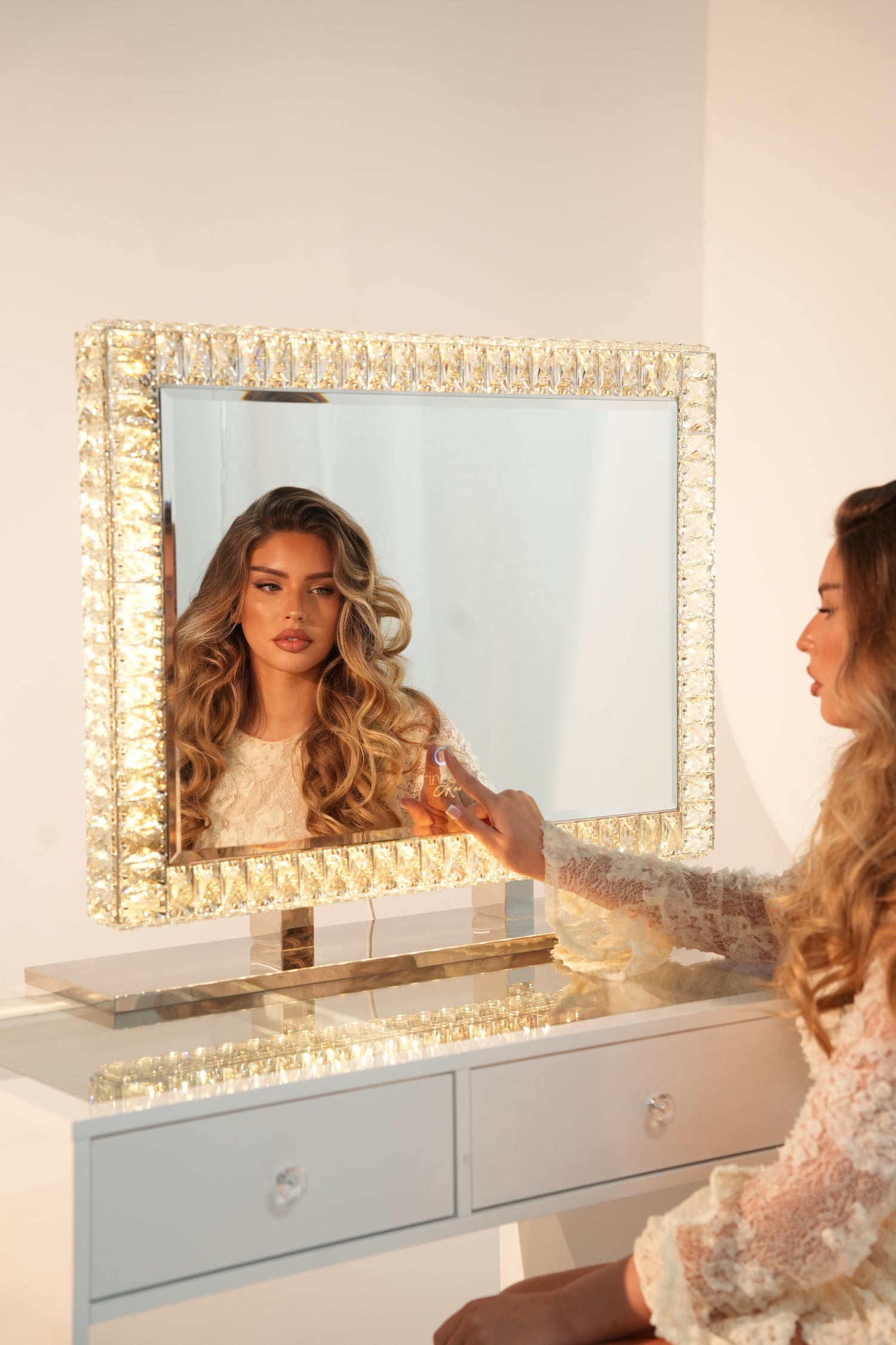 Le miroir iconique, orné de cristaux étincelants et d’un éclairage éclatant.